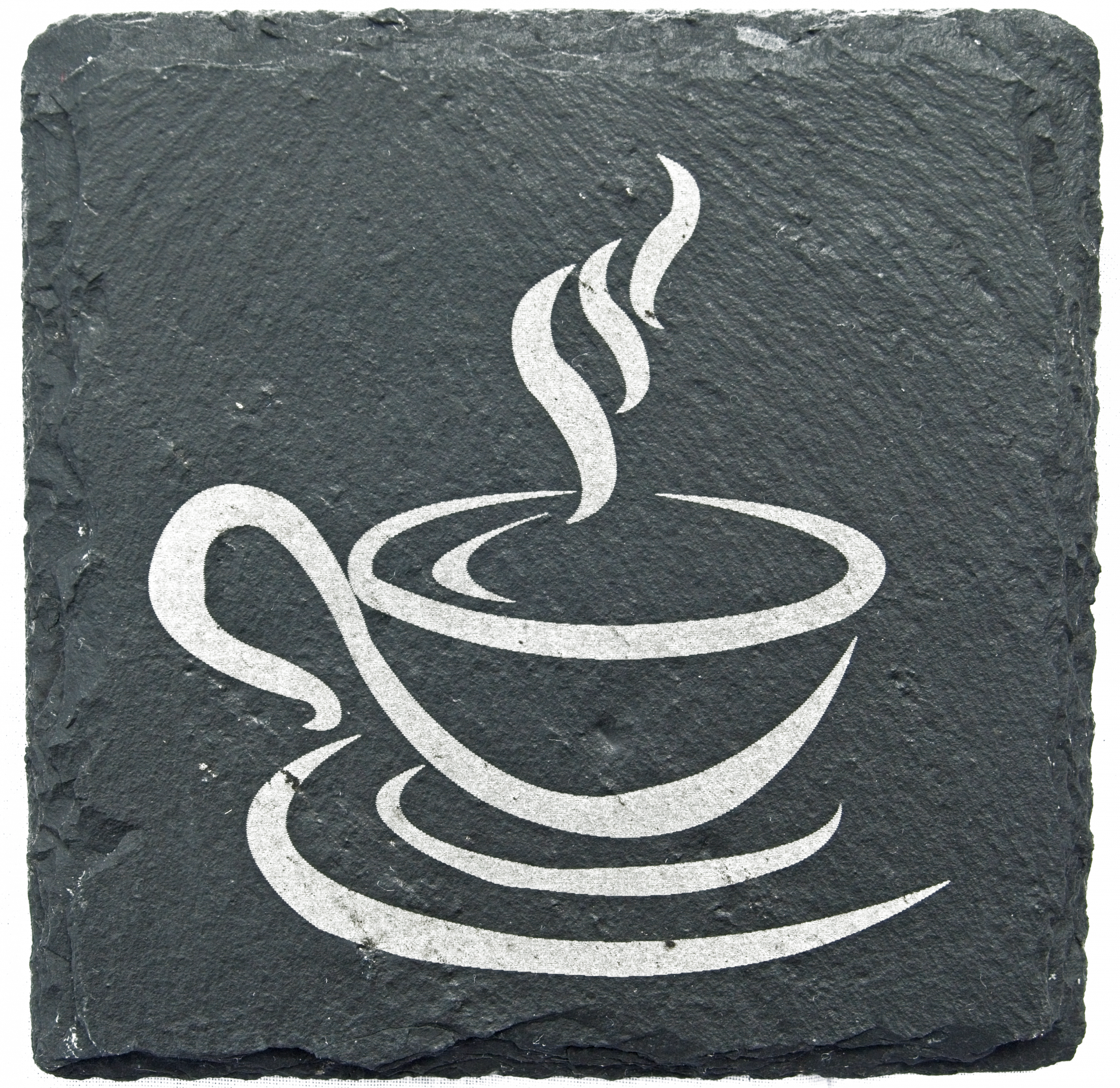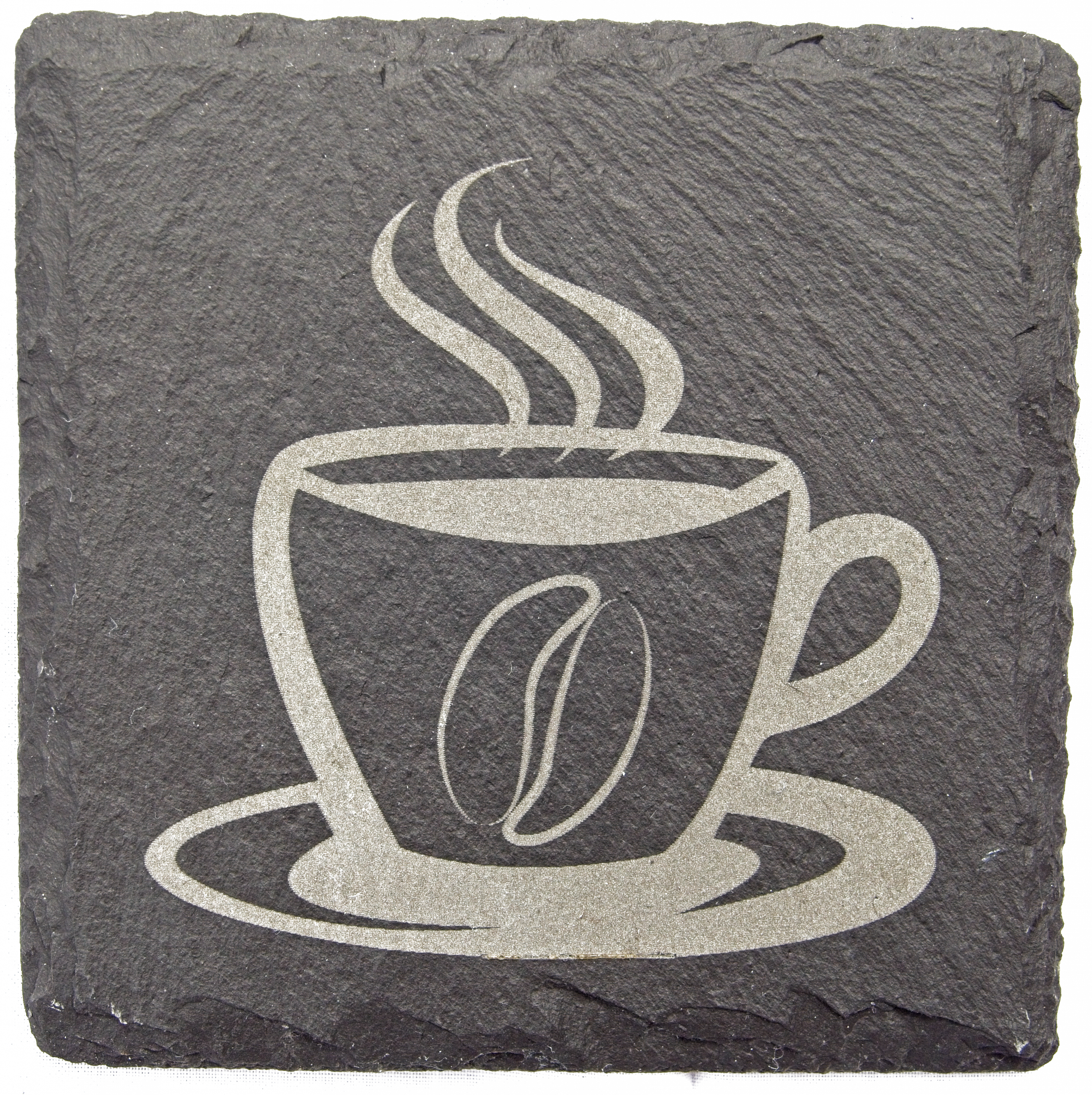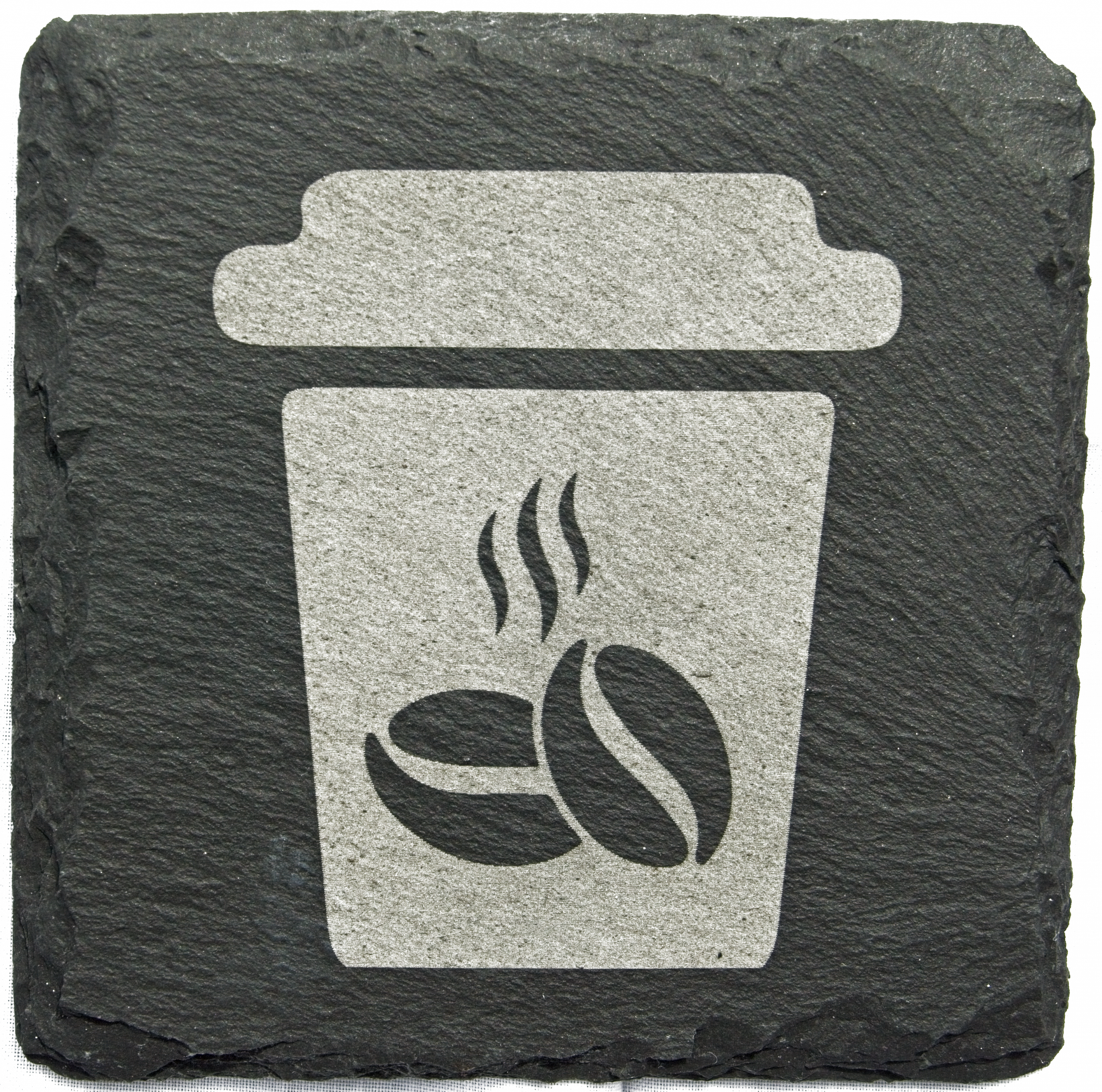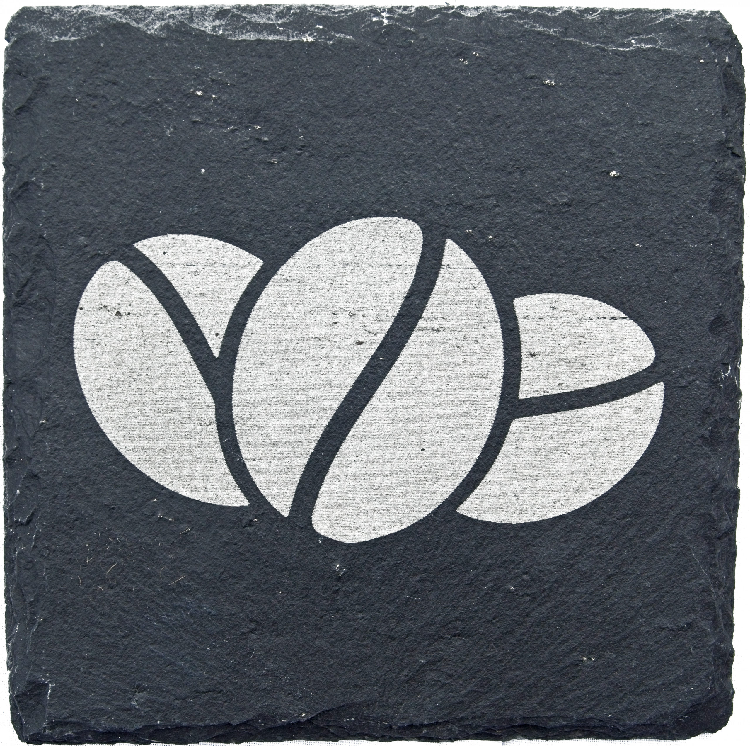 A set of 4 square slate coasters with pictures of coffee cups and beans. See descriptions below for full details.