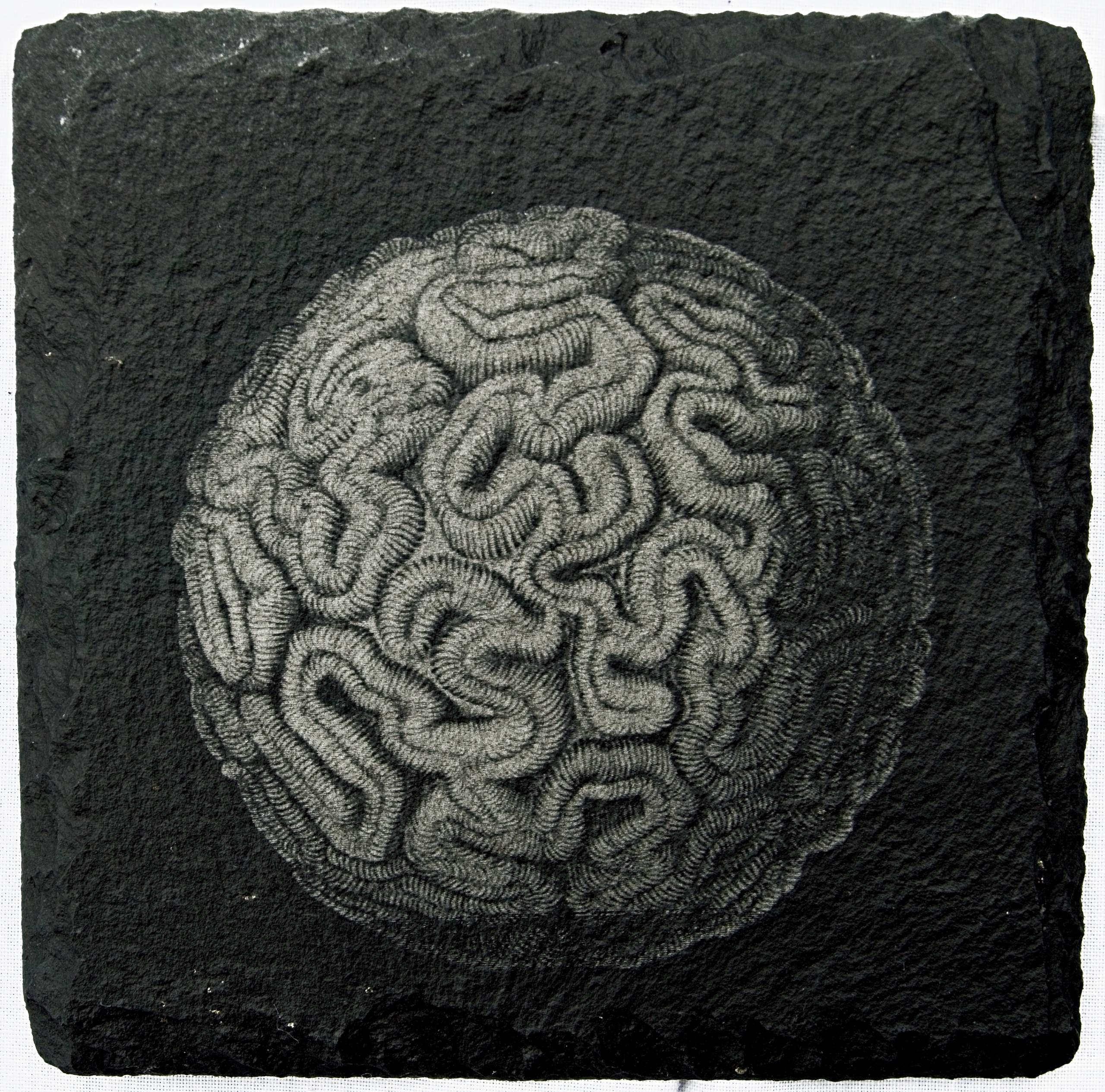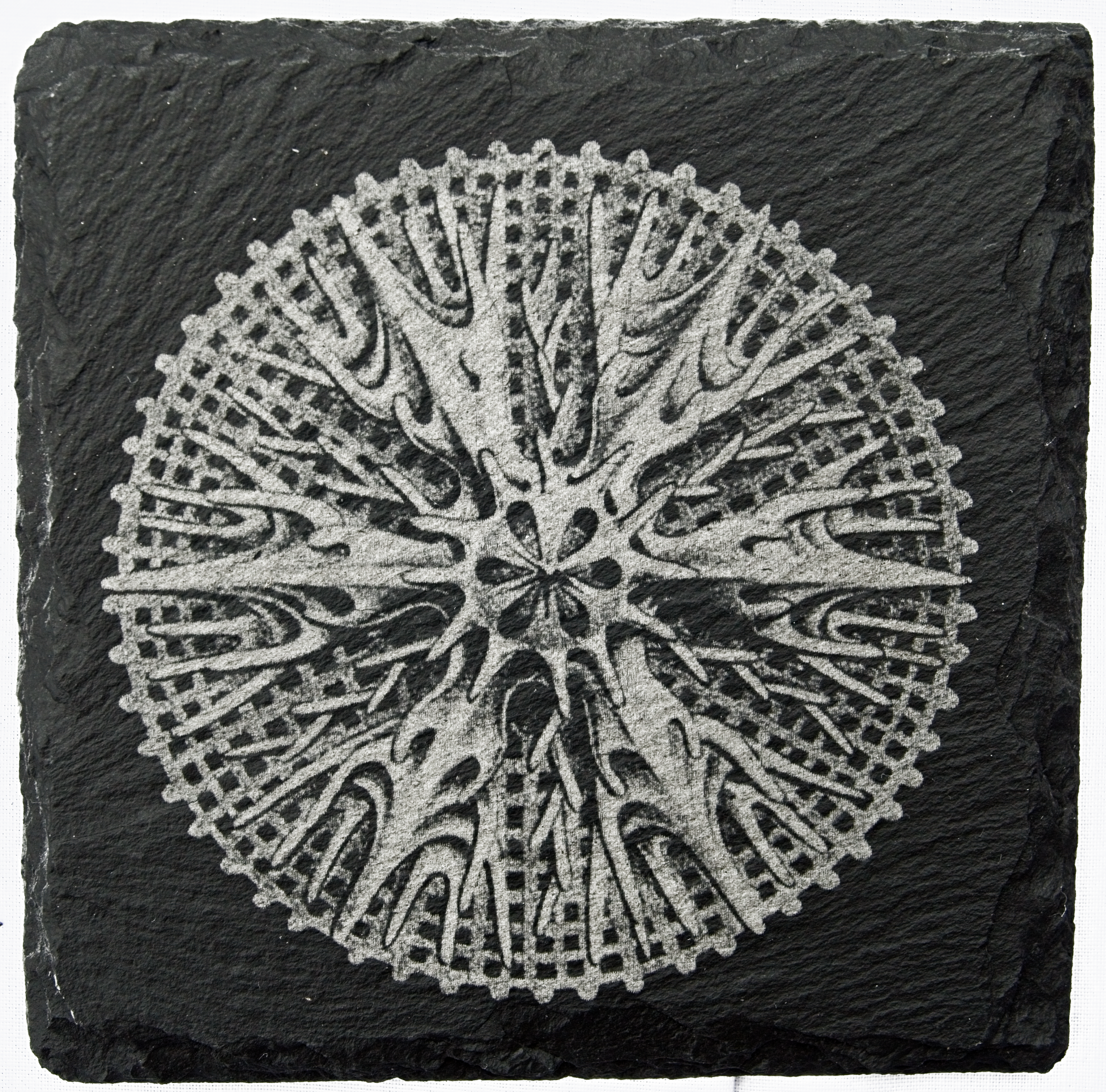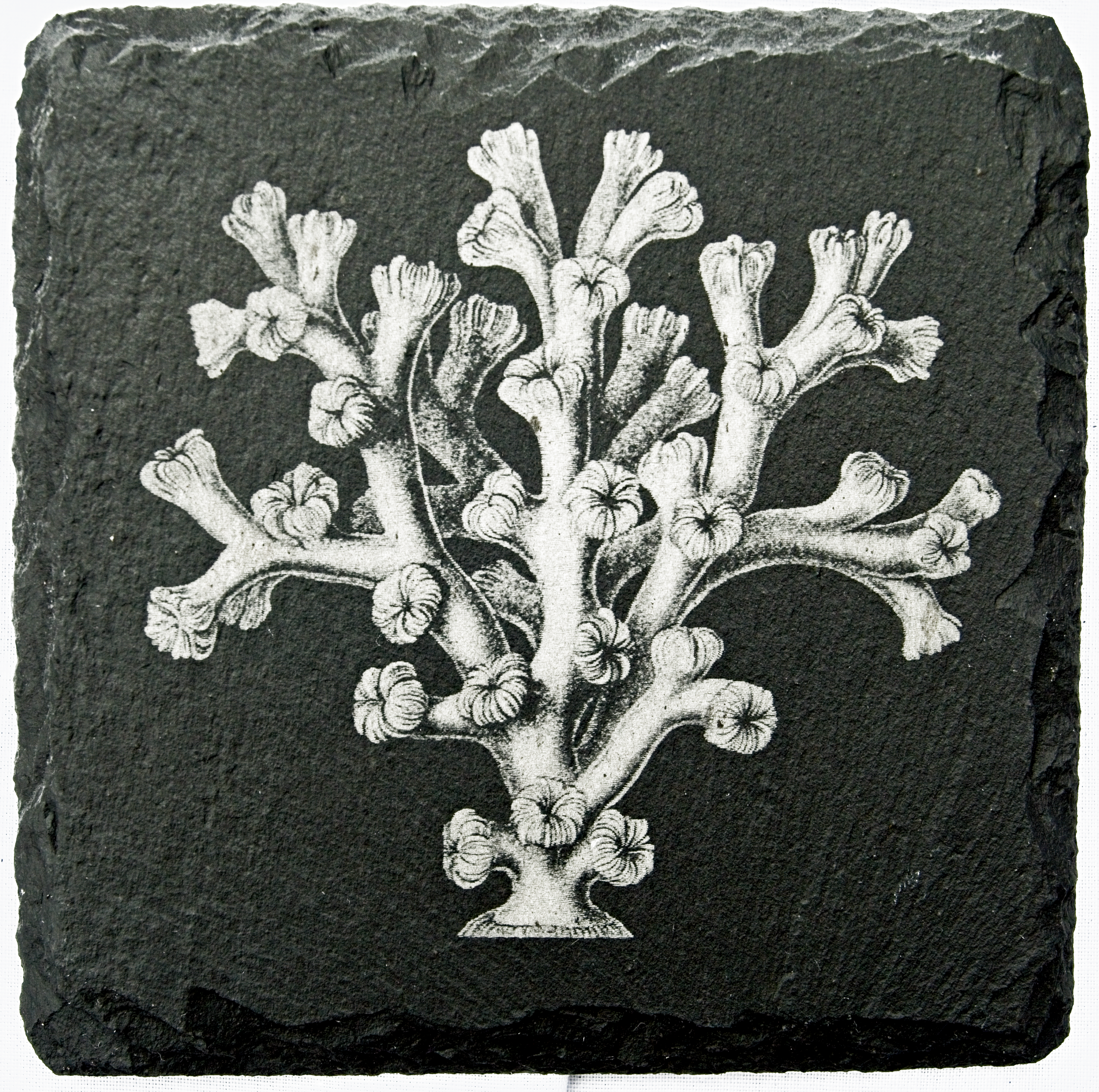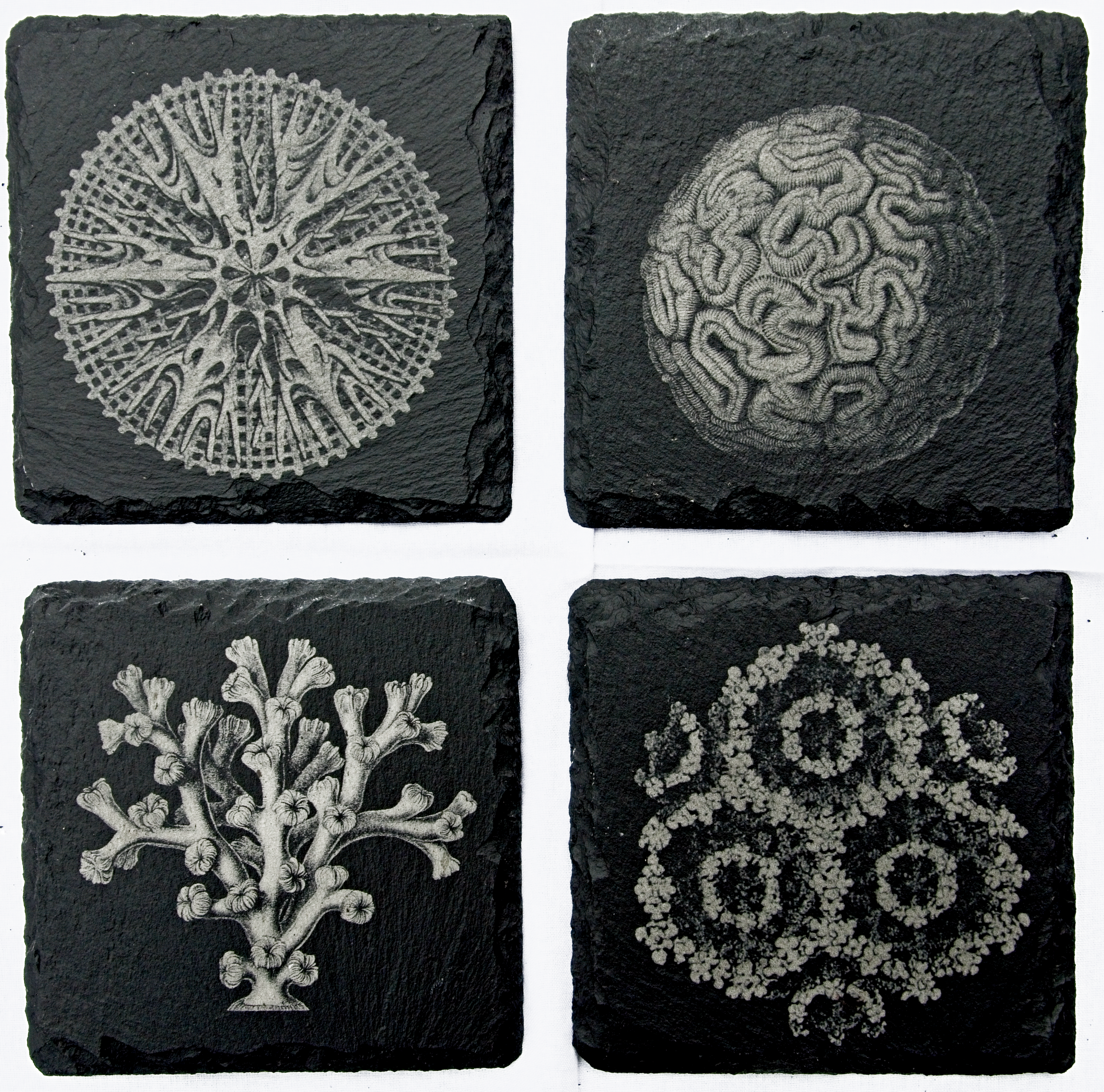 A set of 4 square slate coasters with drawings of coral, taken from Kunstformen der Natur (Artforms of Nature) published 1904 by the artist Enrst Haeckel. See description below for full details.
