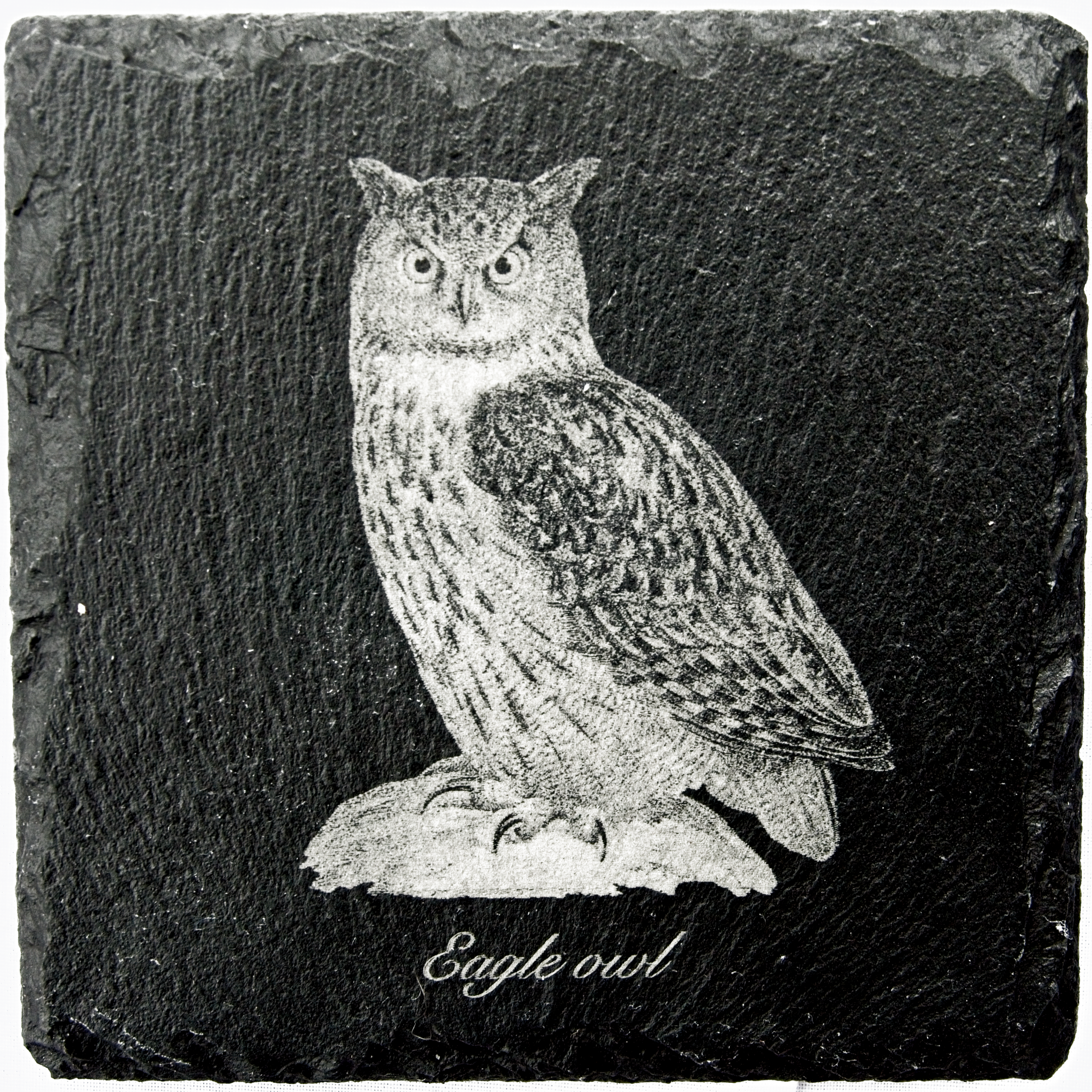 A square slate coaster with a drawing of an Eagle owl by W. Von Wright, published in 1918.