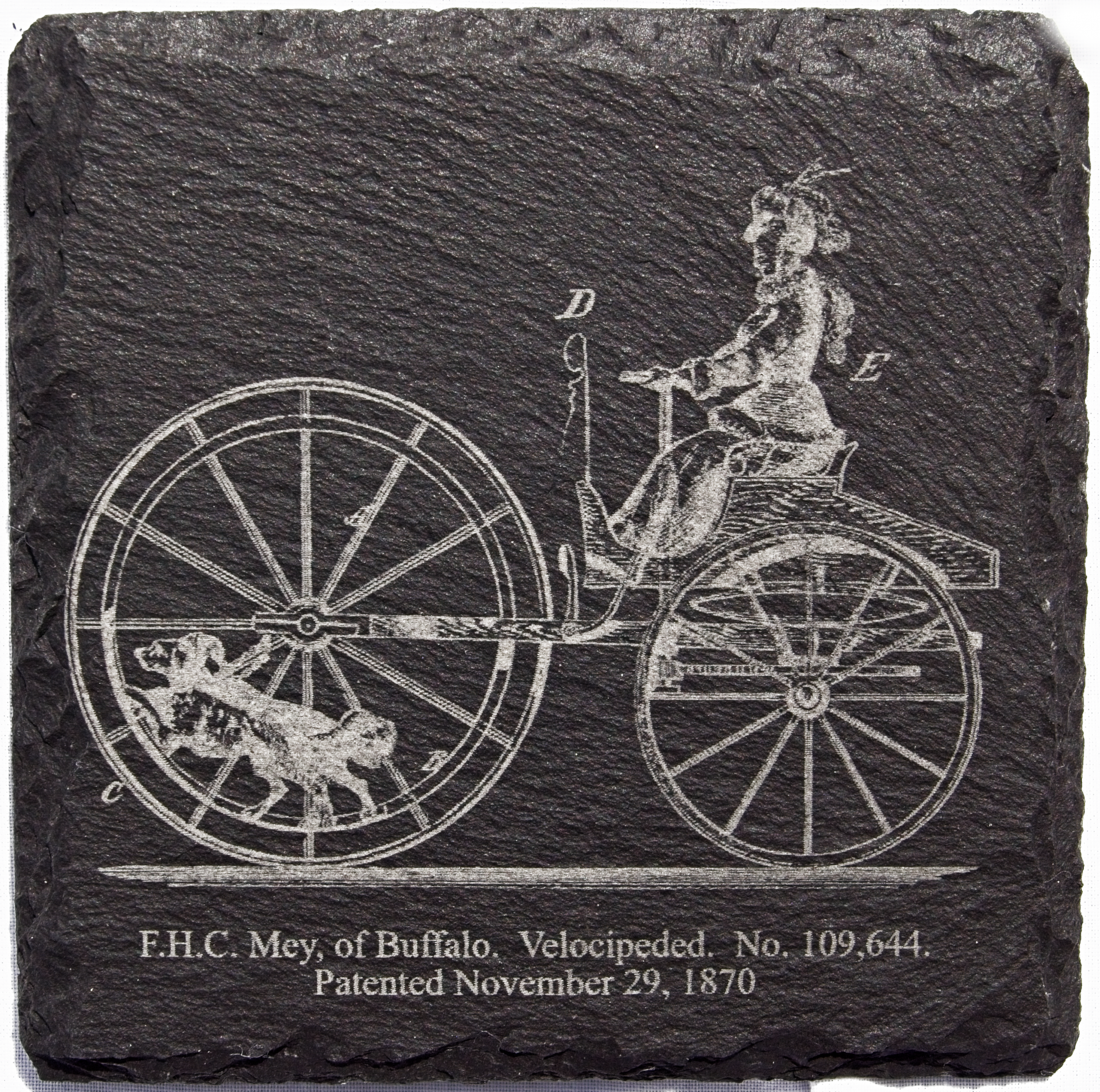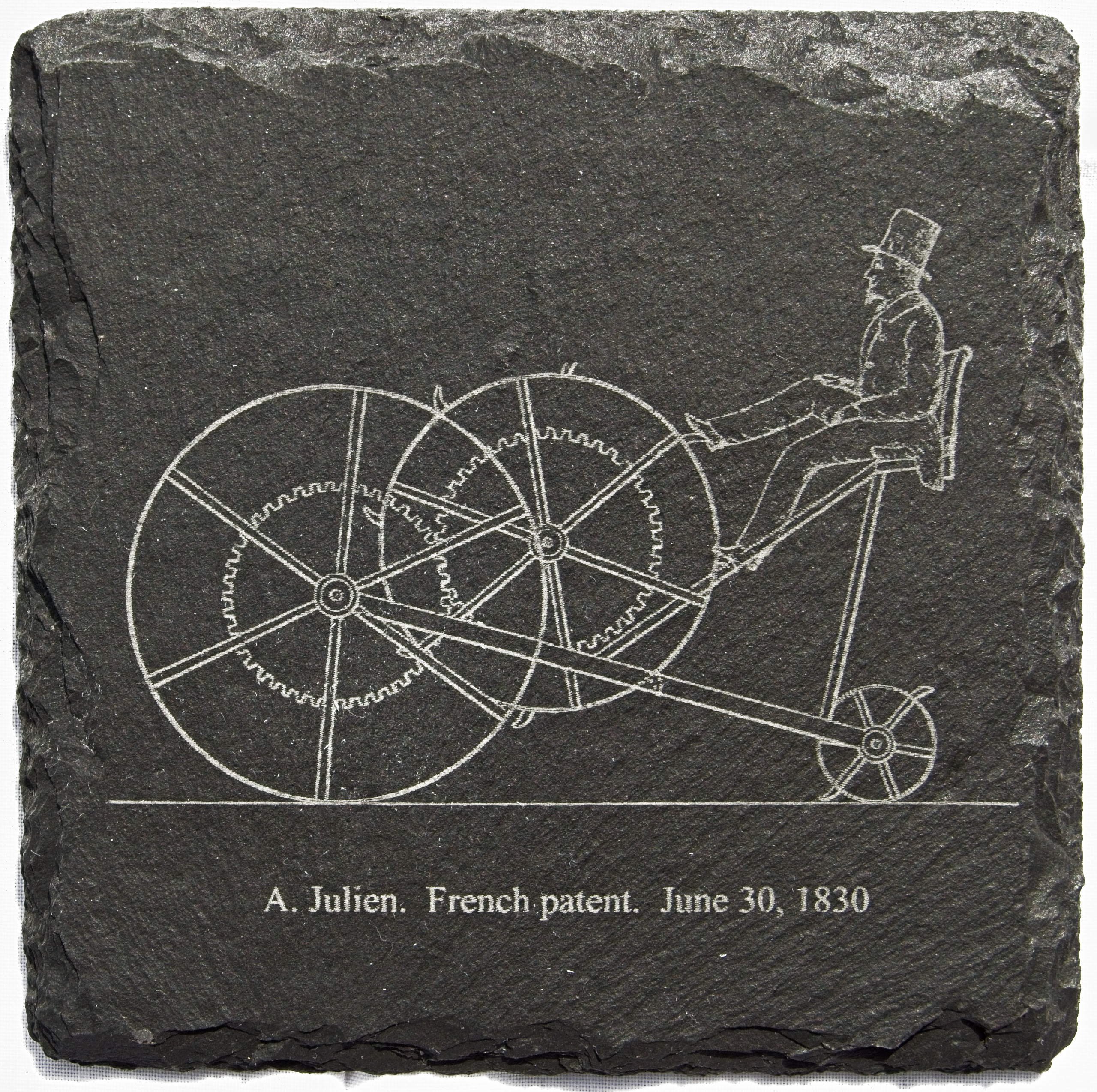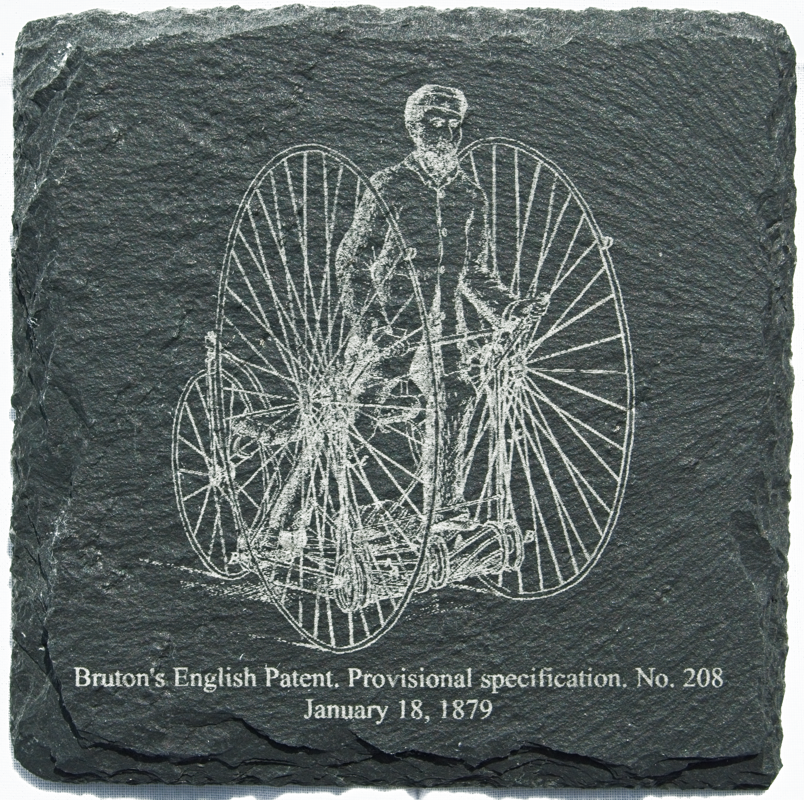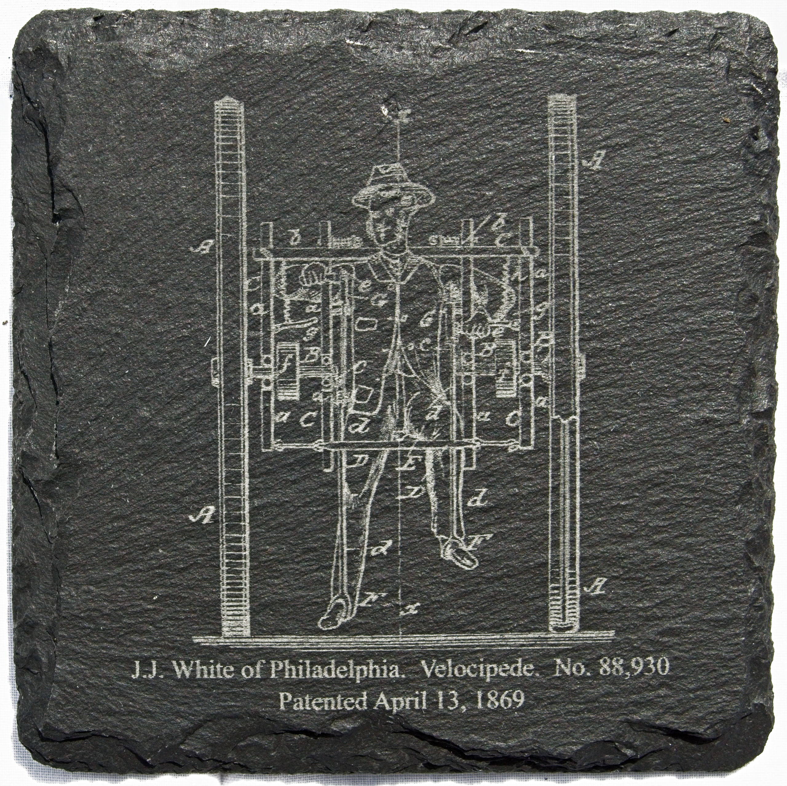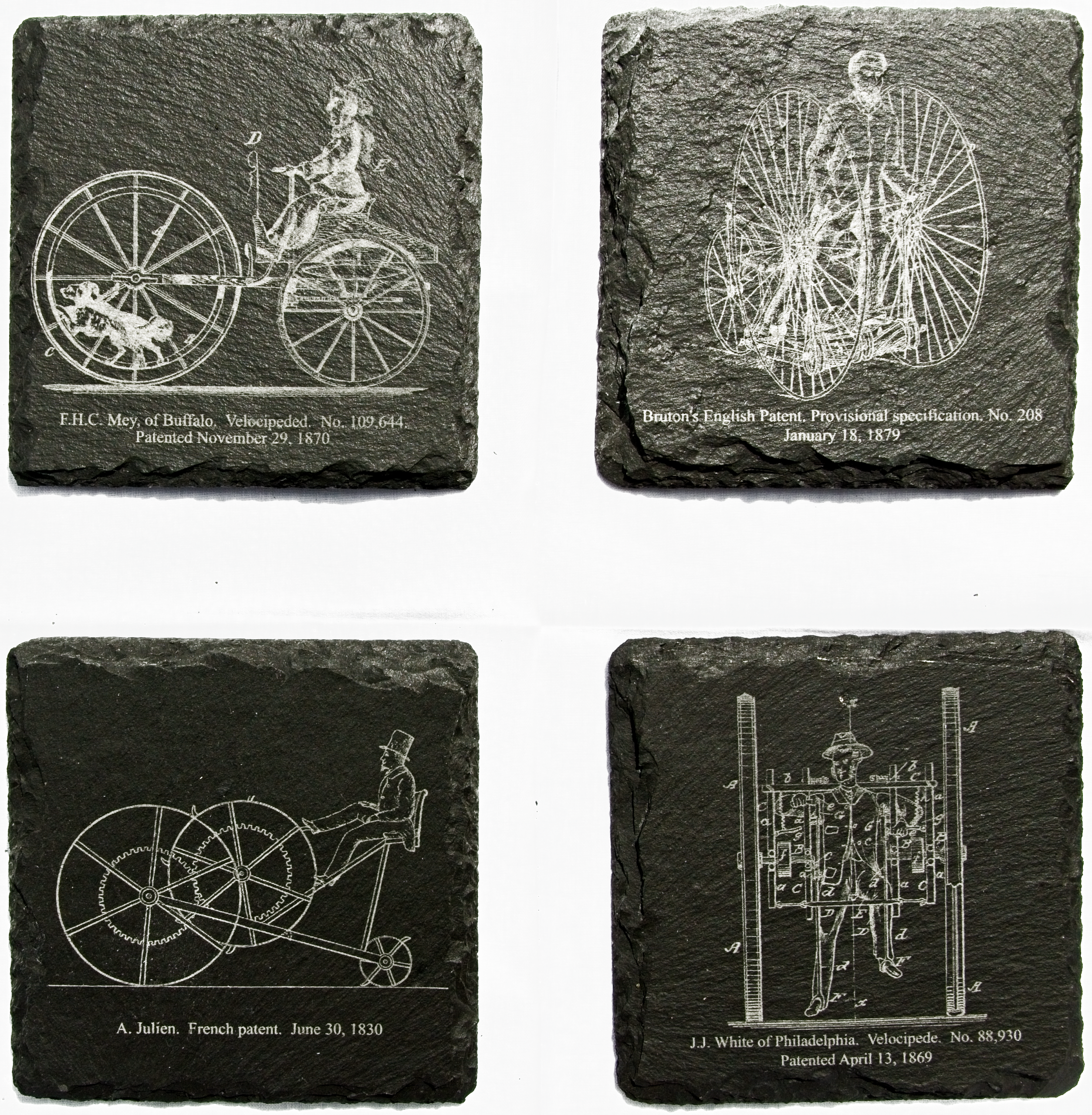 A set of 4 square slate coasters with pictures of blueprints for various “velocipedes” from the early 19th century.