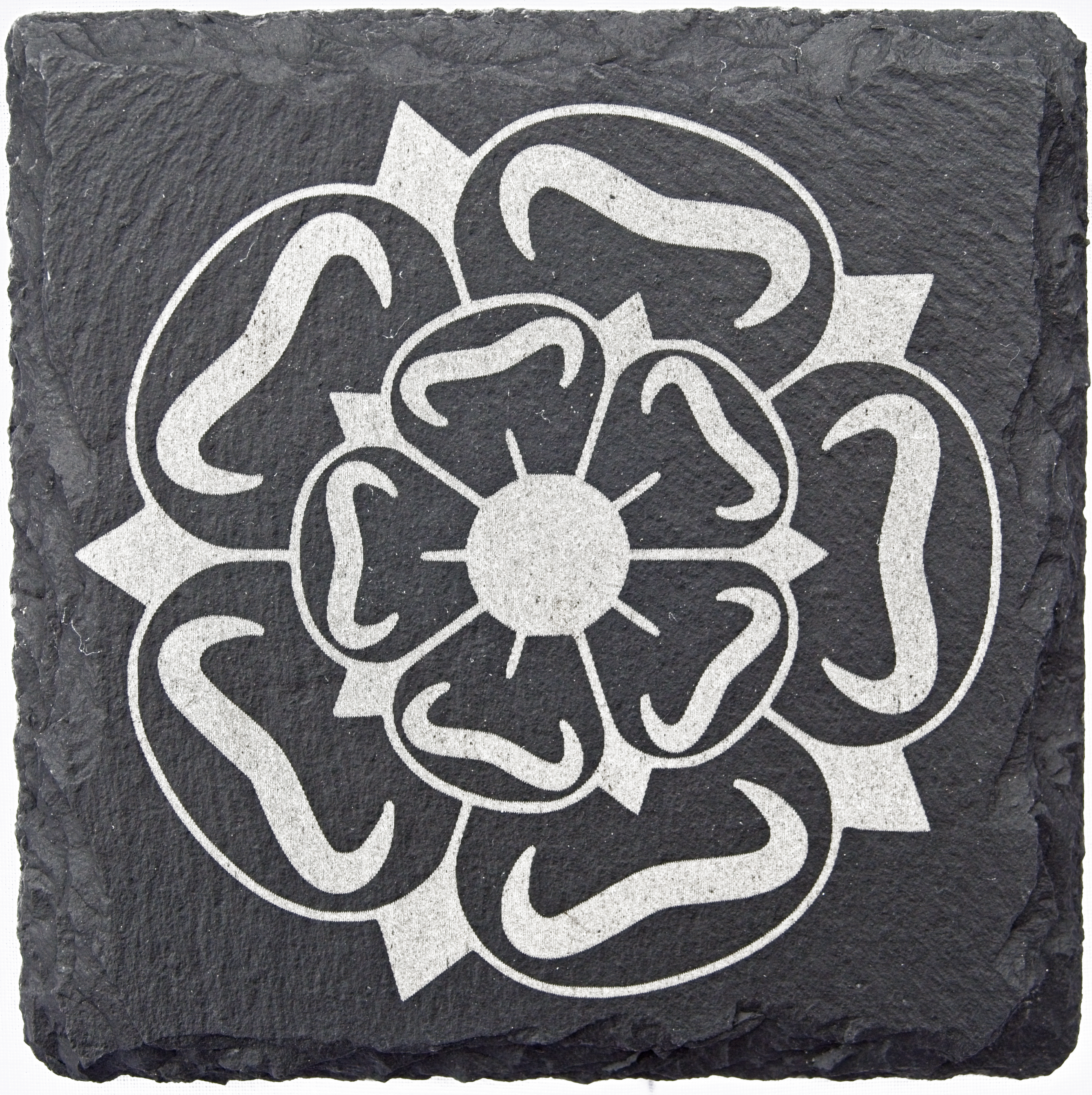 A square slate coaster with a picture of the Yorkshire rose emblem.
