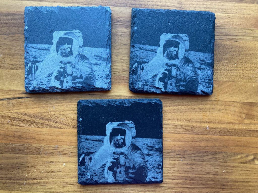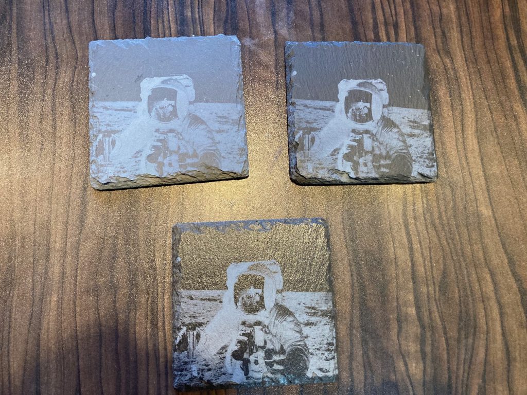 Unfinished – here the slate is left as it is after engraving with the design; no coating is added. This generally gives a more natural look, with a grey slate background. Black areas look grey and there is very little reflection of light. The item may absorb liquids spilled onto it.